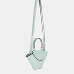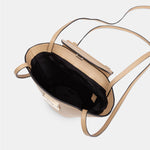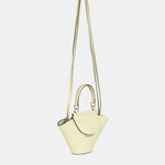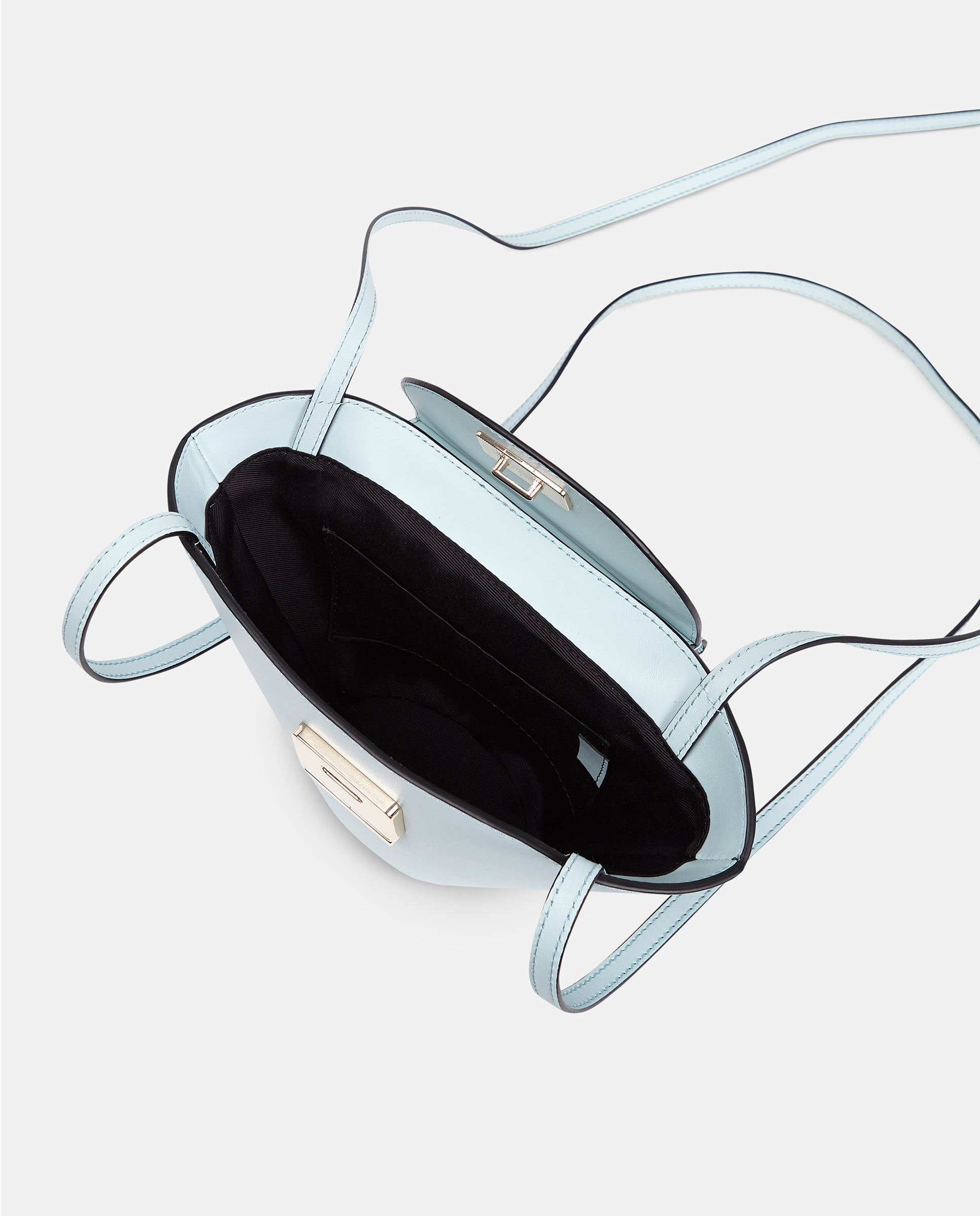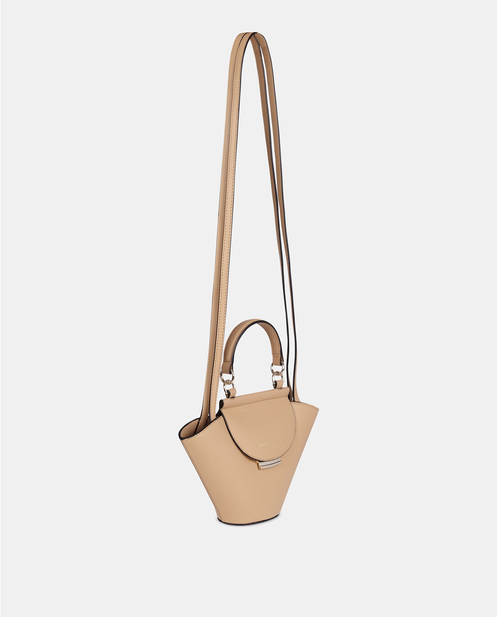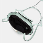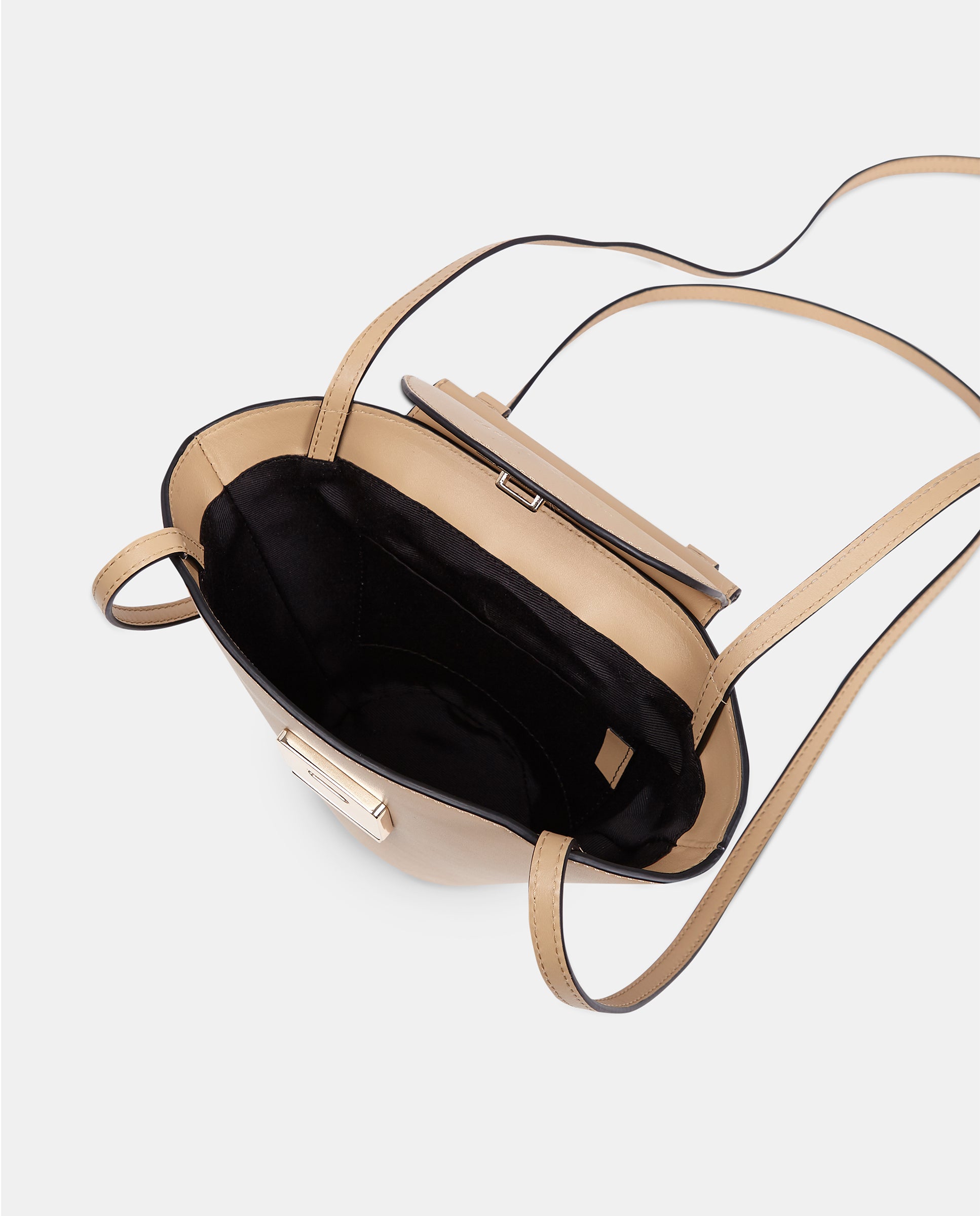 Bolso con doble bandolera. Dos bandoleras largas para poder llevarlo cruzado o al hombro y asa de mano. Cuenta con un cierre metálico de seguridad en la solapa en color oro claro. El interior encontramos un bolsillo de tejido. Tiene el tamaño adecuado para llevar elementos como el teléfono, llaves, cartera y algunos cosméticos. Es un bolso muy cómodo y práctico porque al tener esta forma de capazo, la capacidad es mayor a la apariencia y al abrirlo se puede ver fácilmente todo aquello que llevas dentro de él.