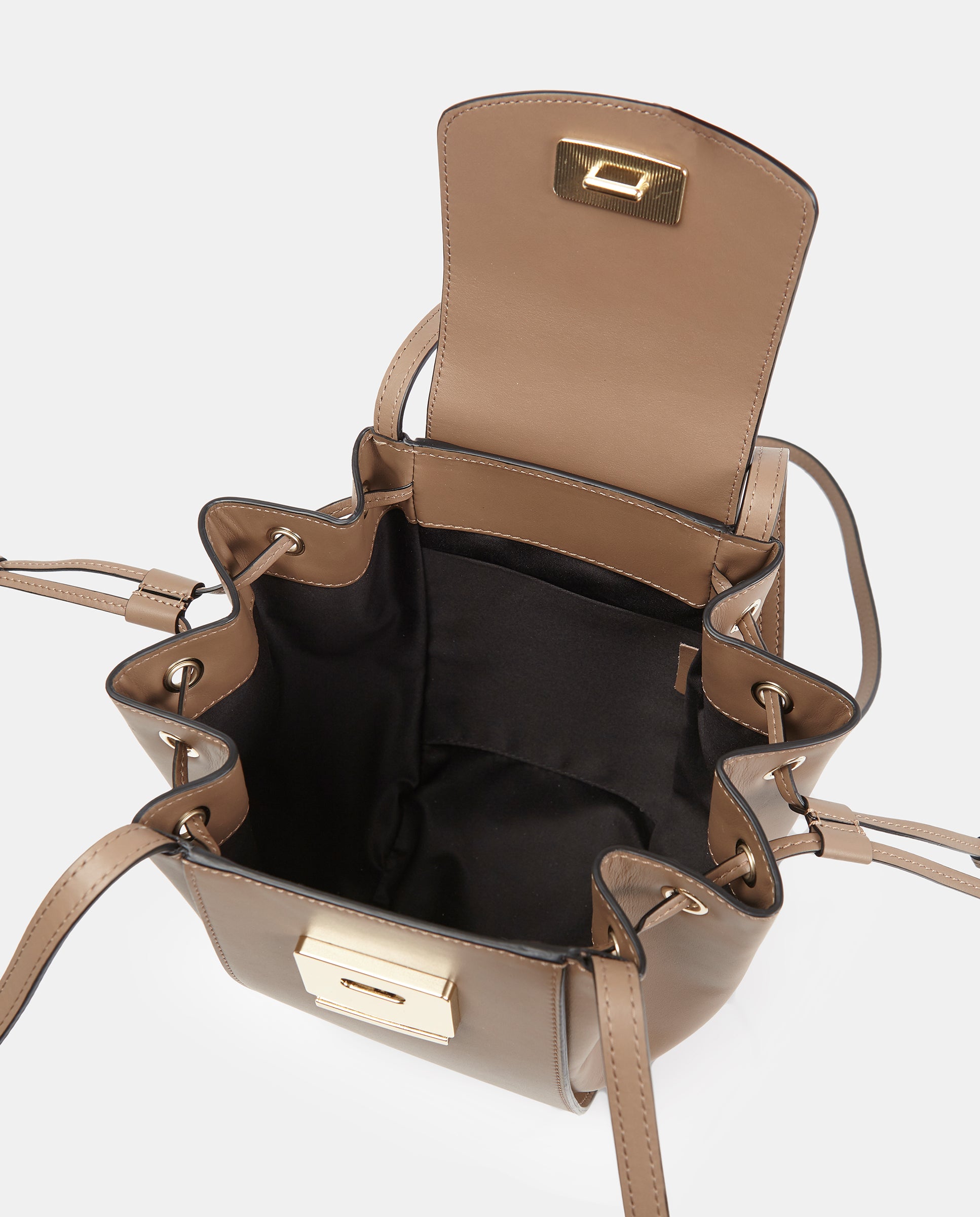 Bolso con doble bandolera larga y cordones laterales para ajustar su capacidad.